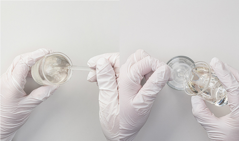 조향용 에탄올 베이스로 유리 비커와 향수 용기를 간단히 세척해 준비합니다. 이후 수업용 정밀 포켓 저울(0.01g/500g)에 50ml 유리 비커를 올려 영점을 맞추고, 오 드 퍼퓸 기준 부향률 15%에 맞춰 향수 베이스 42.5g을 계량합니다.* 오 드 퍼퓸(EDP)은 8~15% 수준의 부향률의 중간 농도의 향수로, 다양한 상황에서 활용하기 좋으며 풍부하고 레이어드된 향이 특징입니다. 복합적인 향을 선호하는 이들이 많이 찾는 대표적인 타입이기도 합니다.