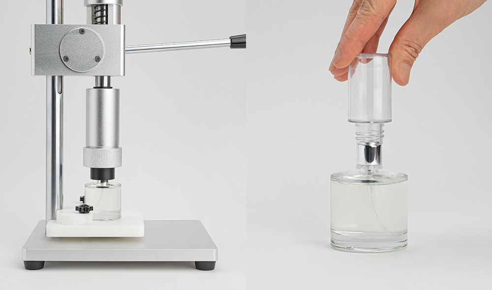 스프레이 노즐은 향수 유리병의 어깨선을 기준으로, 바닥보다 약간 길게 사선으로 잘라 준비합니다.크림프형 향수 용기에 스프레이 노즐을 고정할 때는 ‘향수병 캡핑기 4 in 1’을 사용하면 보다 간편하게 작업할 수 있습니다.