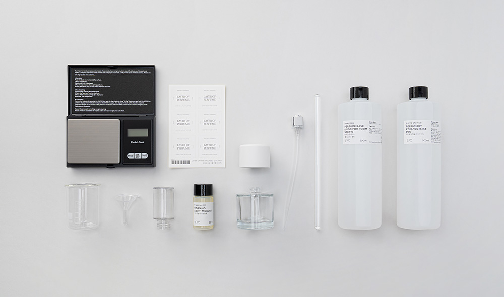 준비물 ㅣ향수 베이스 (룸스프레이 겸용), 아침 햇살의 은방울 꽃 프래그런스 오일, (단품) 클레어 50ml 투명 향수유리용기 공병, 무광 화이트 블록 오버캡, 수업용 정밀 포켓저울 (0.01g/500g), 유리 비커 50ml, 미니 깔때기, 유리 막대, CW 스프레이 툴, 향수병 캡핑기 4 in 1, 조향용 에탄올 베이스 99%, 레이어 오브 퍼퓸 라벨 (Square)